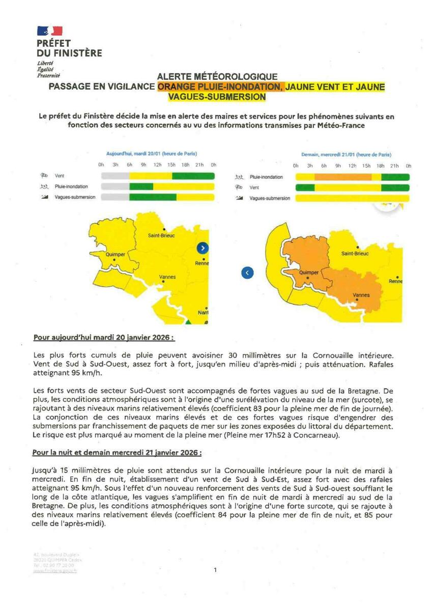 📢Le département du Finistère nous informe d'une alerte météorologique de vigilance ORANGE PLUIE-INONDATION, JAUNE VENT ET VAGUES-SUBMERSION pour aujourd'hui mardi 20 et mercredi 21 janvier 2026.