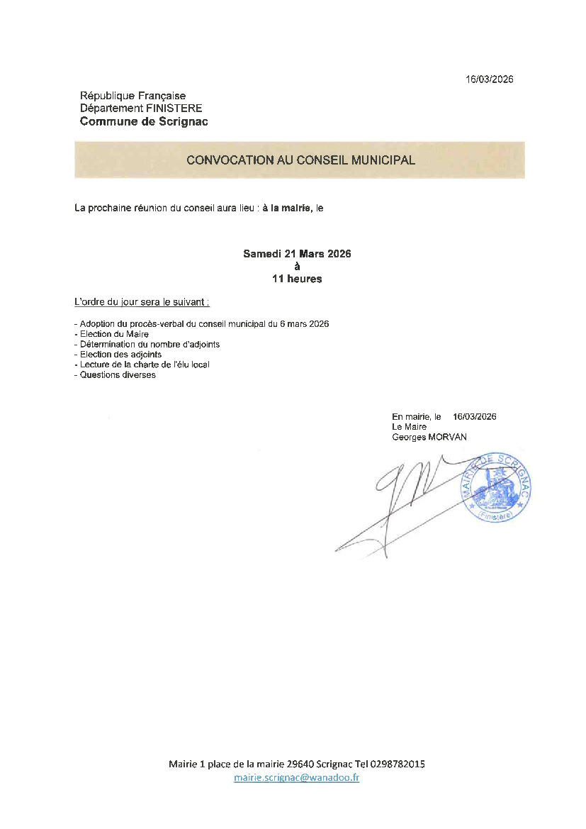 Conseil municipal le samedi 21 mars 2026 à 11 heures 16/03/2026 Ci-joint l'ordre du jour Source : Mairie de Scrignac
