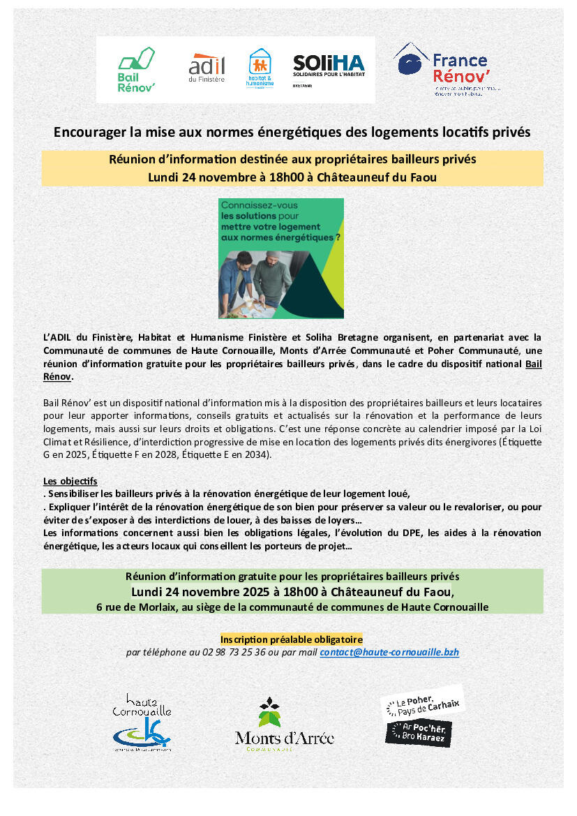 Propriétaires bailleurs : réunion information 20/11/2025 Lundi 24 novembre 2025 à 18h00 à Châteauneuf-du-Faou