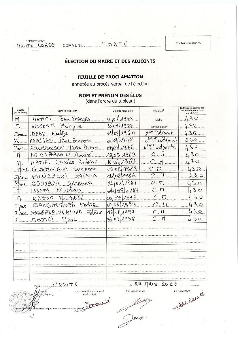 Faisant suite à l’élection de ce 22 mars veuillez trouver la composition du Conseil Municipal qui représentera fièrement notre commune pour ce nouveau mandat.