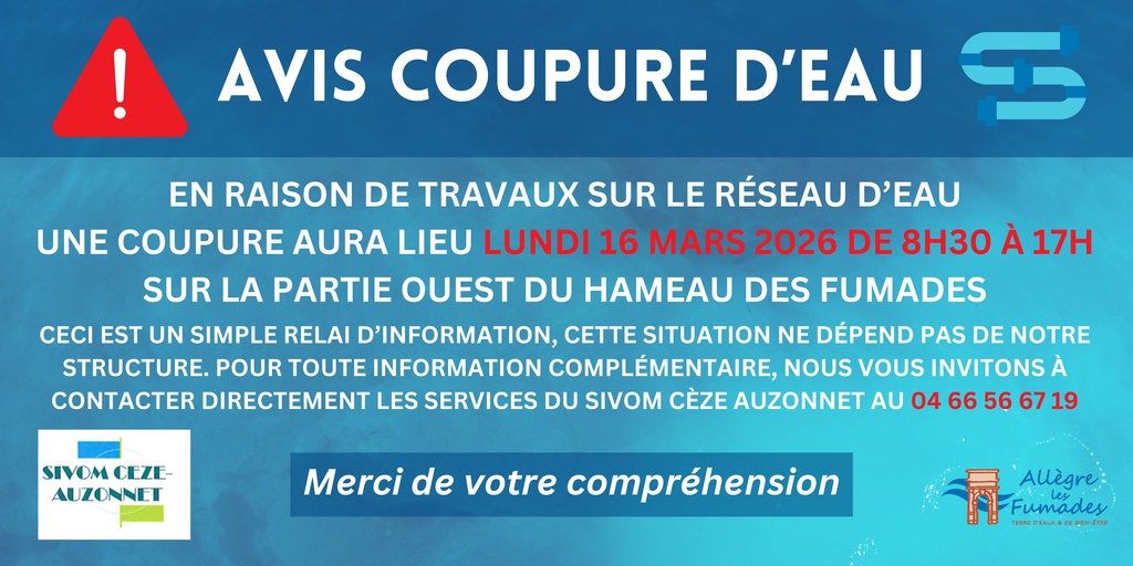 ⚠️AVIS COUPURE D'EAU⚠️ 16.03.2026 Les Fumades