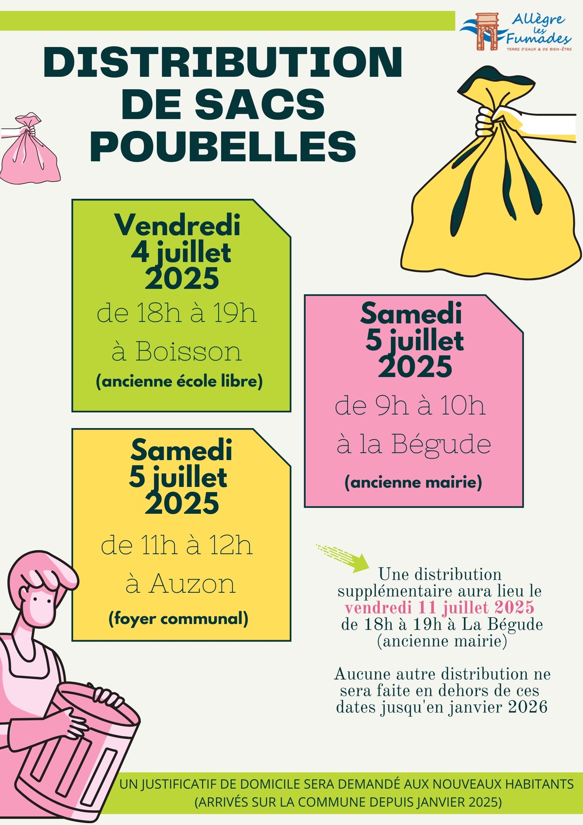 ❌ RAPPEL Distribution de sacs poubelles ❌ 09/07/2025 DISTRIBUTION SUPPLÉMENTAIRE LE VENDREDI 11 JUILLET DE 18H À 19H À LA BÉGUDE (ANCIENNE MAIRIE)