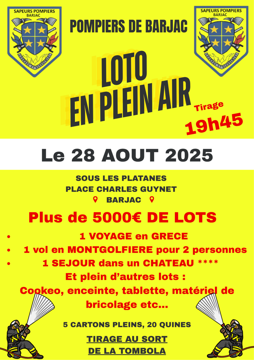 Loto des Pompiers - Jeudi 28 août,à partir de 19h45 22/08/2025 Loto des Pompiers Jeudi 28 août, à partir de 19h45