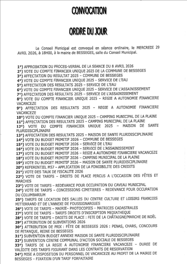 Conseil Municipal 23/04/2026 Le conseil municipal de Bessèges aura lieu le mercredi 29 avril 2026 à 18h, dans la salle du conseil municipal situé au 1er étage de la mairie.