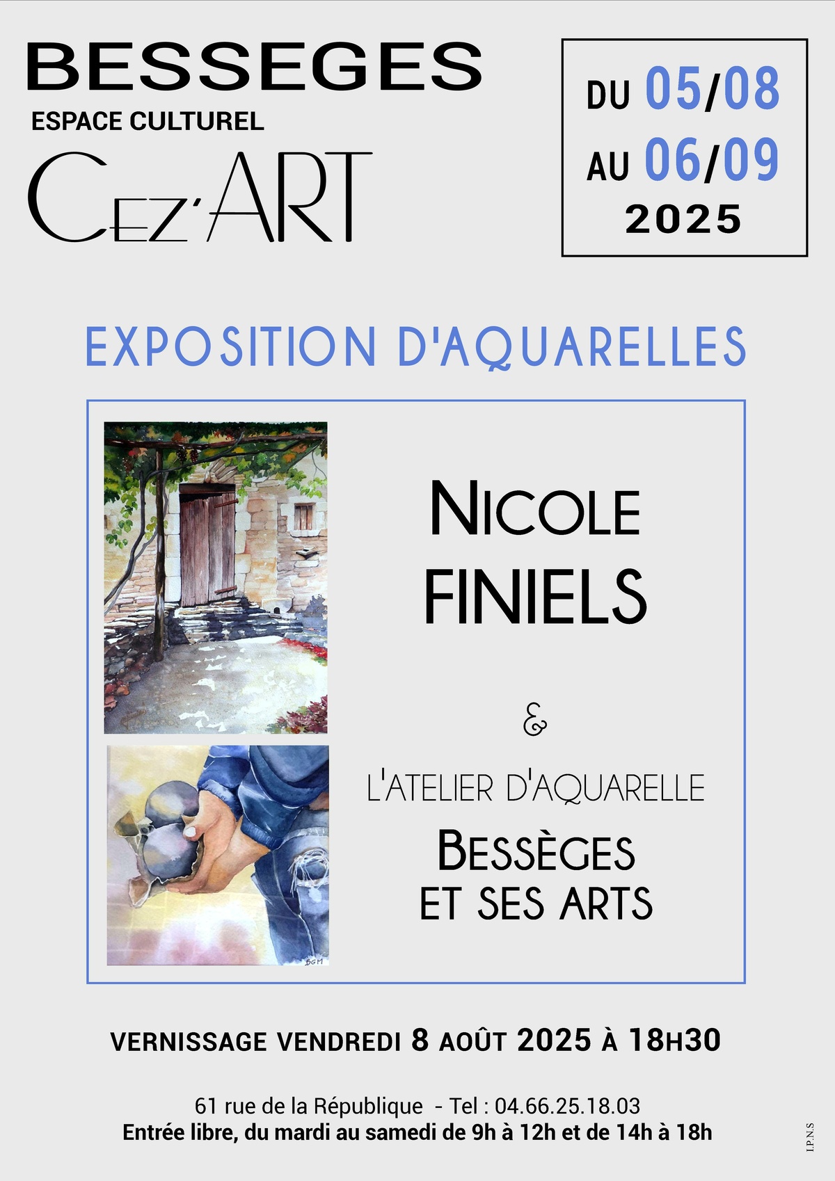Exposition d'aquarelles 29/08/2025 Du 5 août au 6 septembre 2025. Espace Cez'art 61 rue de la République. Entrée libre. Source : Mairie de Bessèges