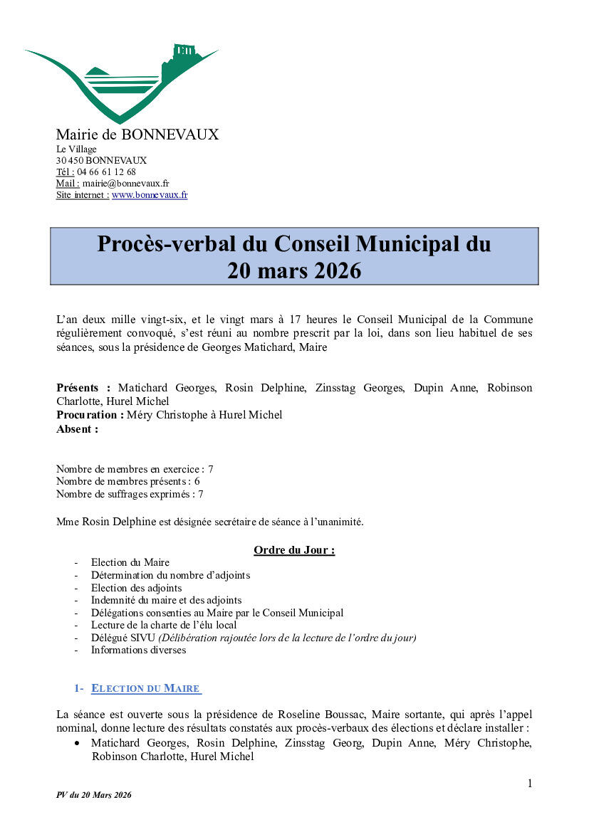 Compte rendu du Conseil Municipal du 20 mars 2026 27/03/2026 Veuillez trouver ci joint le compte rendu du conseil municipal du vendredi 20 mars 2026