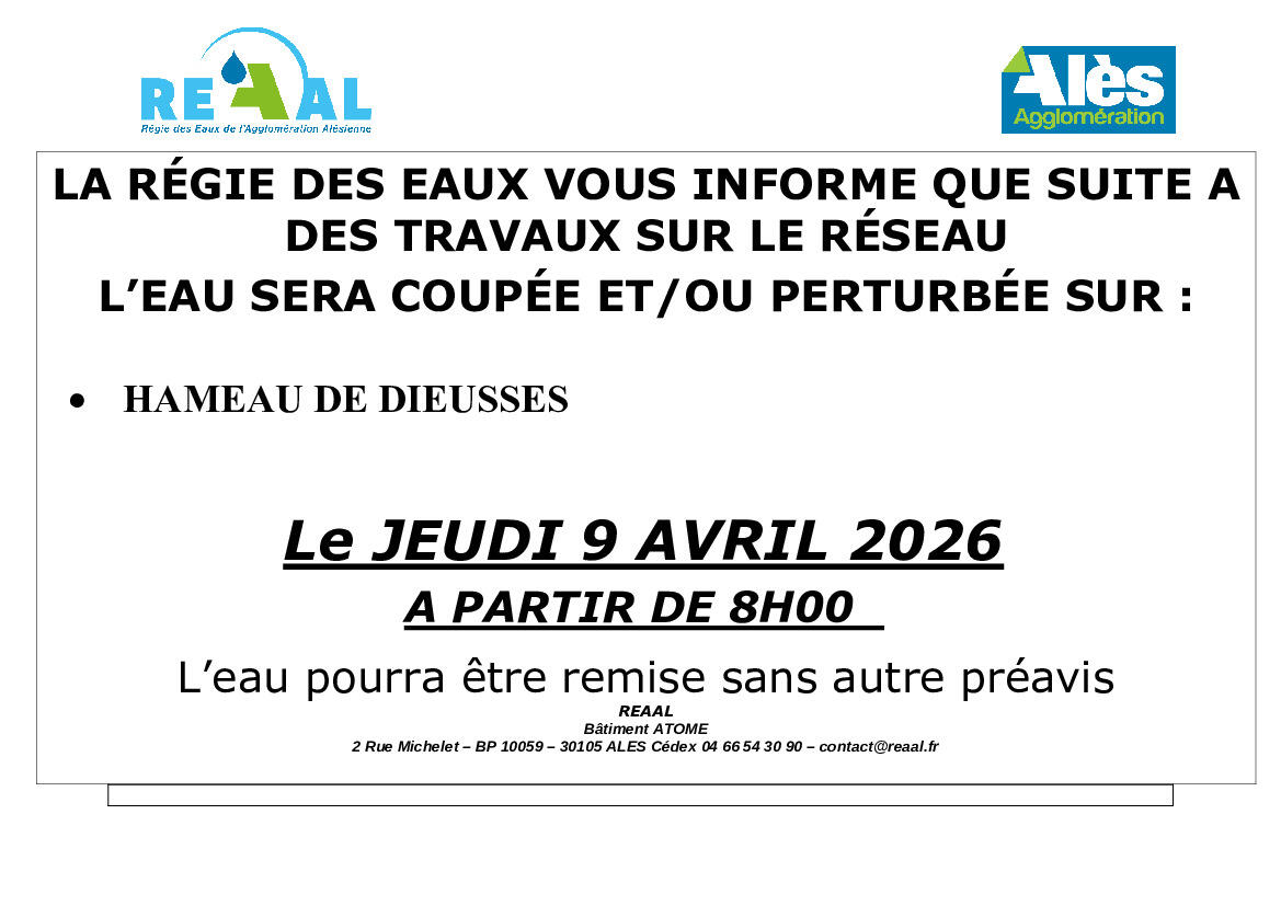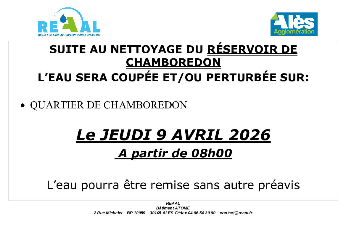 Suite au nettoyage des réservoirs de DIEUSSES et CHAMBOREDON, l'eau sera coupée et/ou perturbée le jeudi 9 avril 2026 à partir de 8h00.