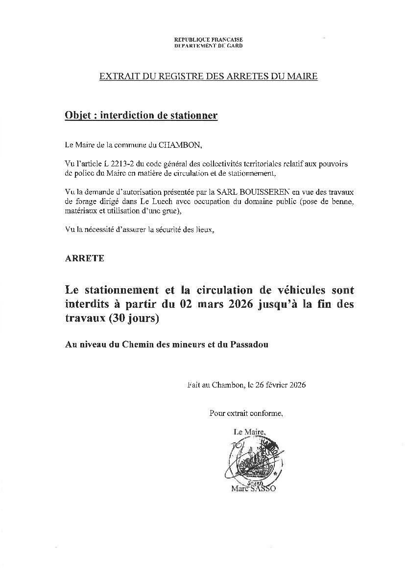 le stationnement et la circulation sont interdits à partir du 02 mars pendant un mois au niveau du chemin des mineurs et du Passadou pour cause du début des travaux pour le forage dirigé