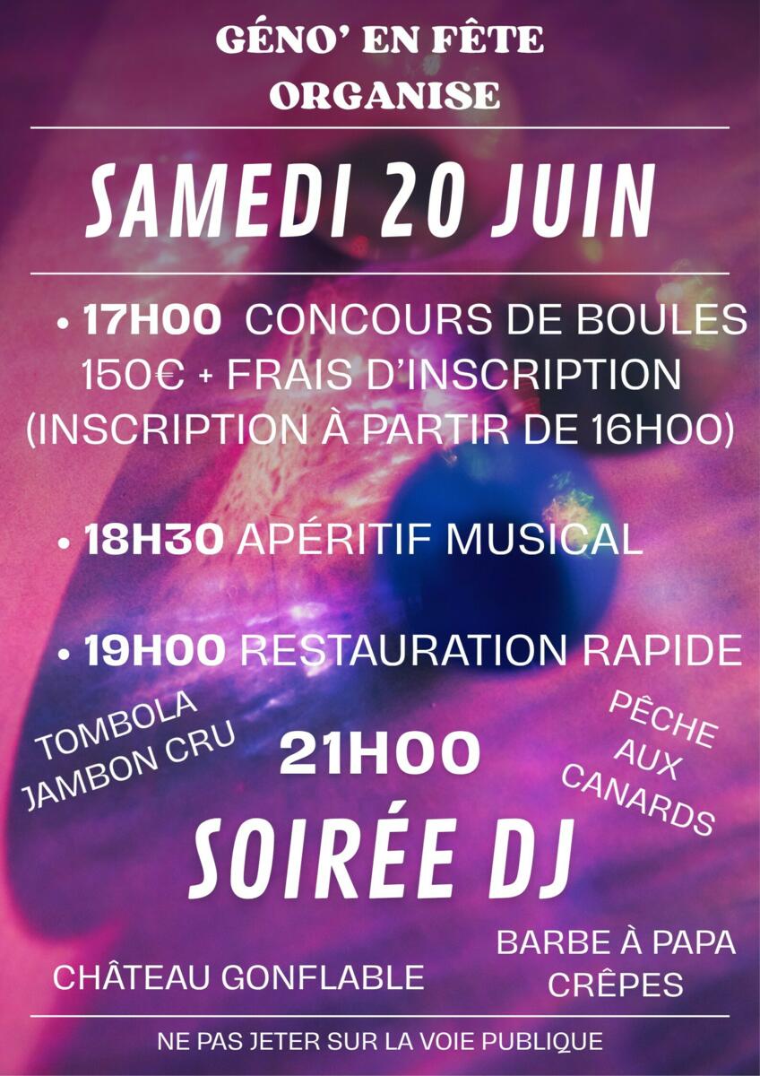 L'association GENO EN FETE organise un concours de pétanque, un apéritif musical et une restauration rapide le SAMEDI 20 JUIN, place du Colombier