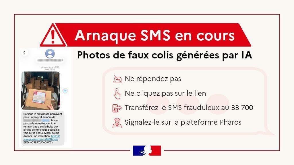 Arnaque Par Sms 30/03/2026 Arnaque ⚠️ Attention ! Un nouveau type d'arnaque circule par SMS depuis quelques jours. Vous avez reçu une photo d'un « livreur » tenant un colis à votre nom ? 📱 Elle est peut-être générée via l'IA dans le but de vous arnaquer.