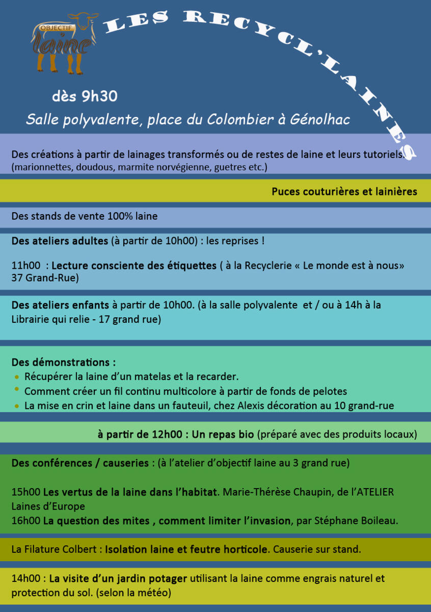 Rendez-vous le 28 février à la salle polyvalente de Génolhac pour ce moment autour de la laine dans nos maisons et dans nos jardins, ou bien sa faculté à être retransformée pour une deuxième vie.