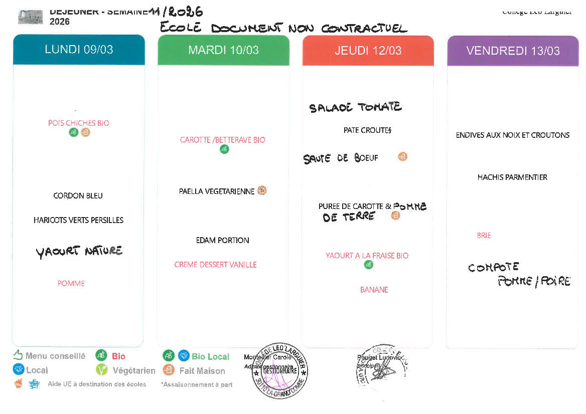 Menu des écoles du 9 au 13 mars