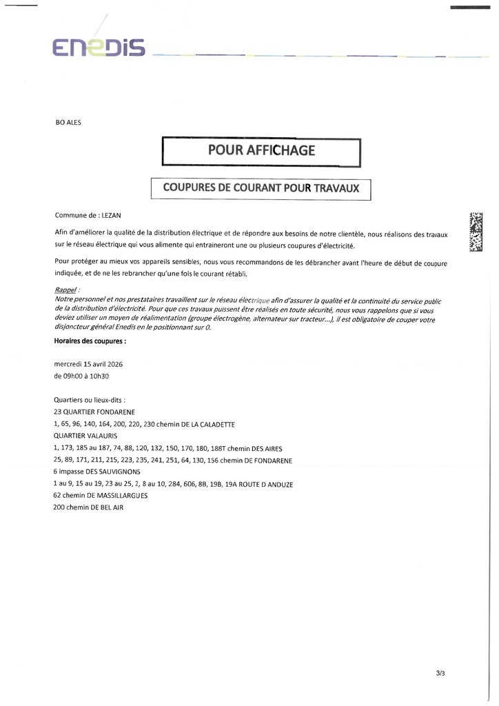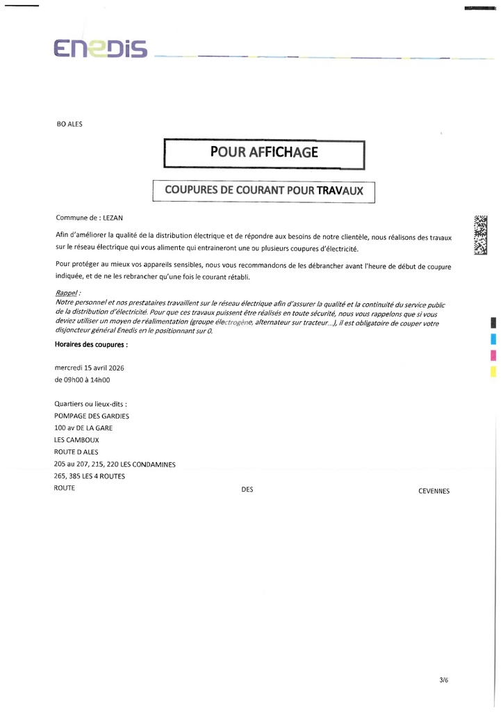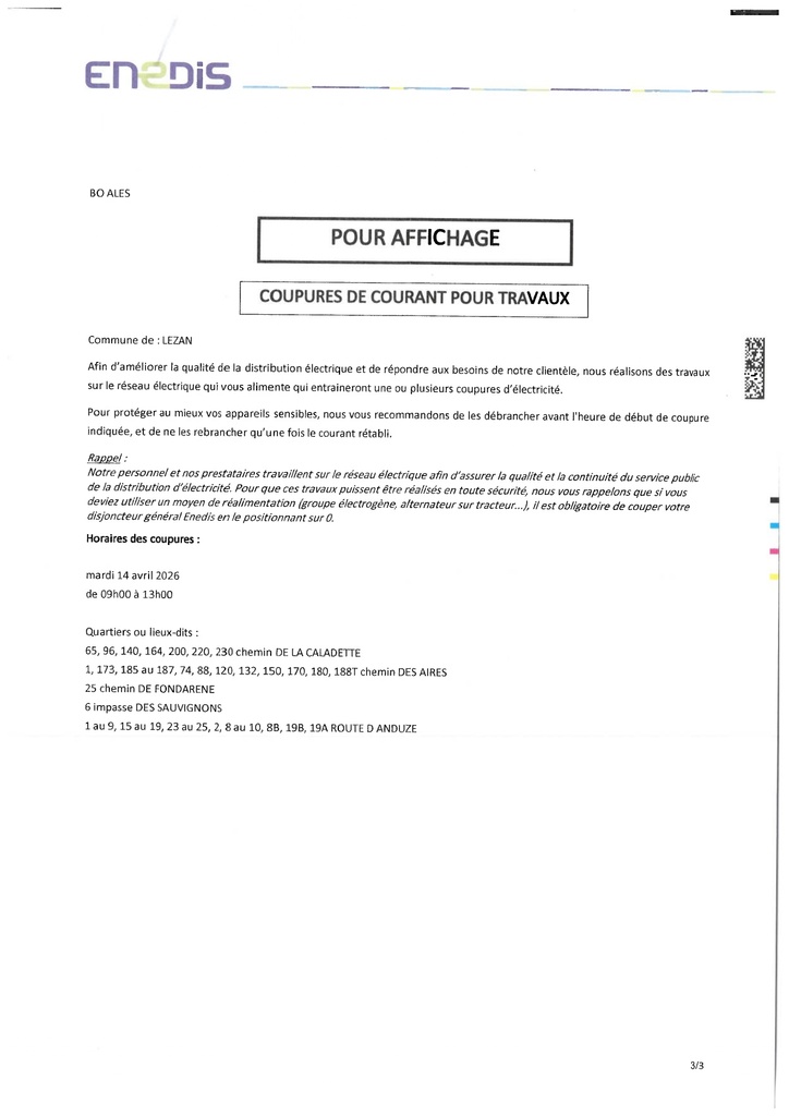 / ENEDIS Coupures de courant les 14 et 15 avril 2026