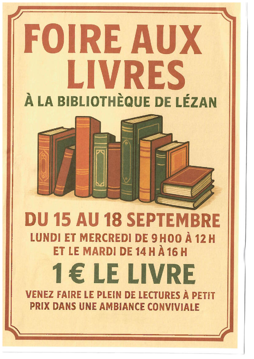 Foire aux livres 04/09/2025 Du 15 au 18 septembre , Foire aux livres à la Biblio Venez nombreux Source : Mairie de Lézan