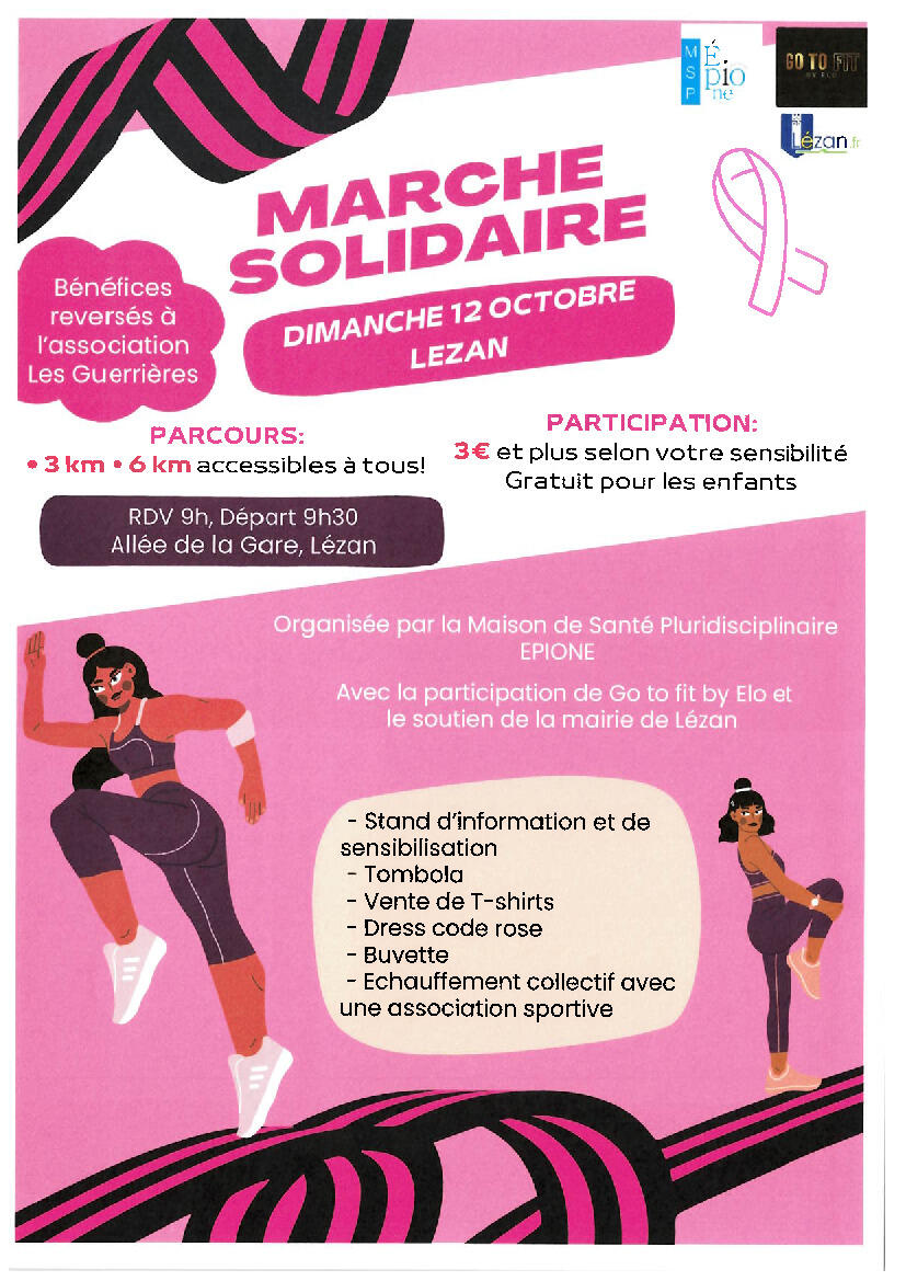 Le 12 octobre prochain , la Maison de santé pluridisciplinaire Epione organise une marche solidaire au bénéfice de l'association  les Guerrières avec la participation de GoToFit By Elo et le soutien de la mairie de Lézan.