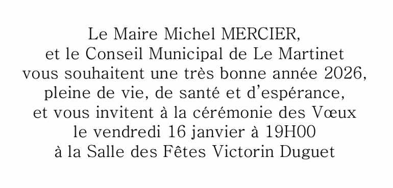 Cérémonie des voeux 15/01/2026 La Cérémonie des voeux du Martinet aura lieu vendredi 16 janvier 2026 à 19 h. Source : Mairie Le Martinet