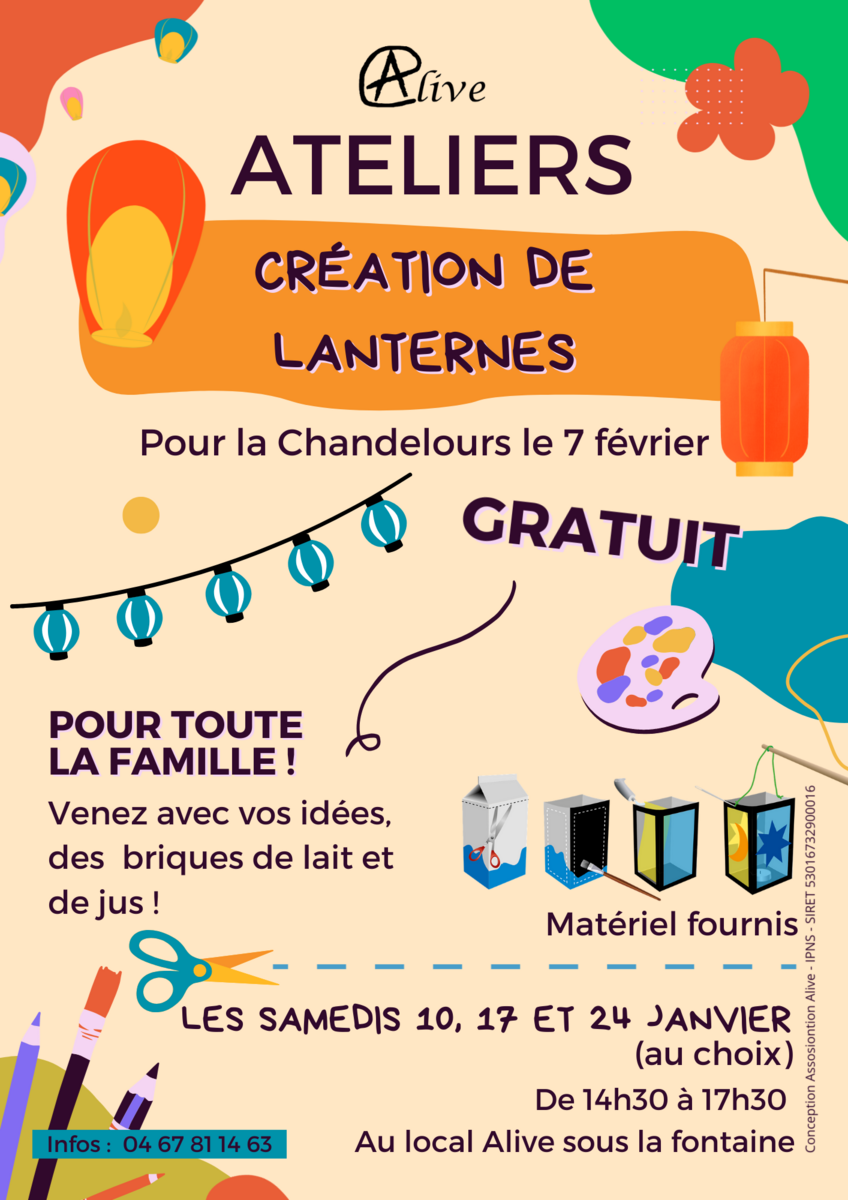 Alors pour préparer ce week-end de fête, rejoignez l’équipe d’Alive lors des ateliers création de lanternes les samedis 10, 17 et 24 janvier de 14h30 à 17h30, auront lieux dans le local alive sous la fontaine !!!