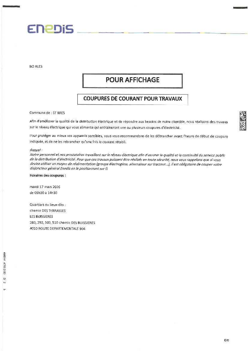 Coupure Enedis ,Le 17/03/2026 de 9h30 à 14h30.