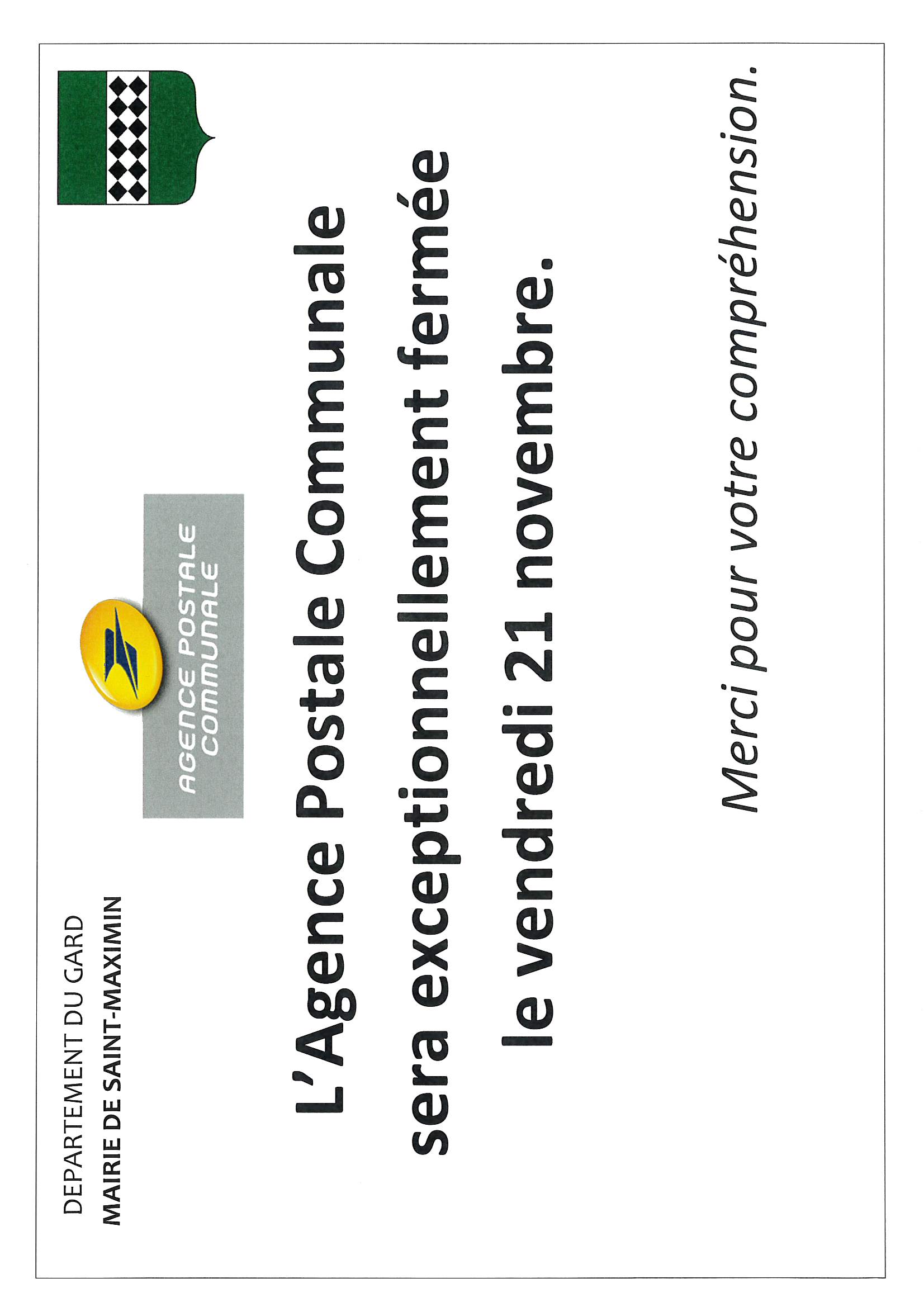 / Fermeture de l'Agence Postale : vendredi 21 novembre 2025