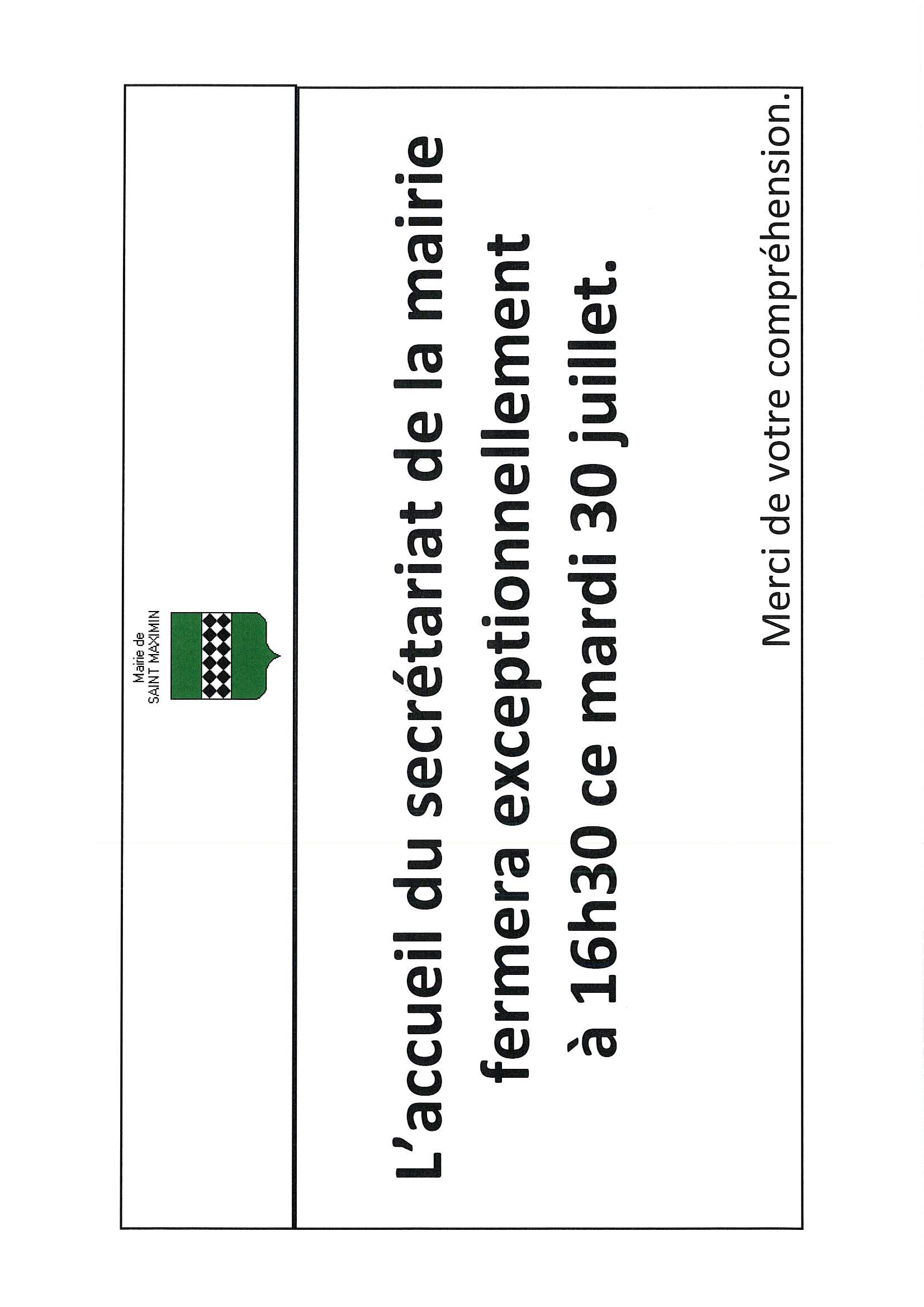 / Fermeture exceptionnelle à 16h30 mardi 30 juillet