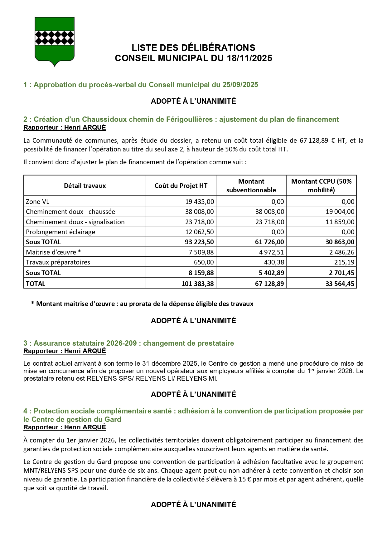 Liste des délibérations du Conseil Municipal du 18 novembre 2025