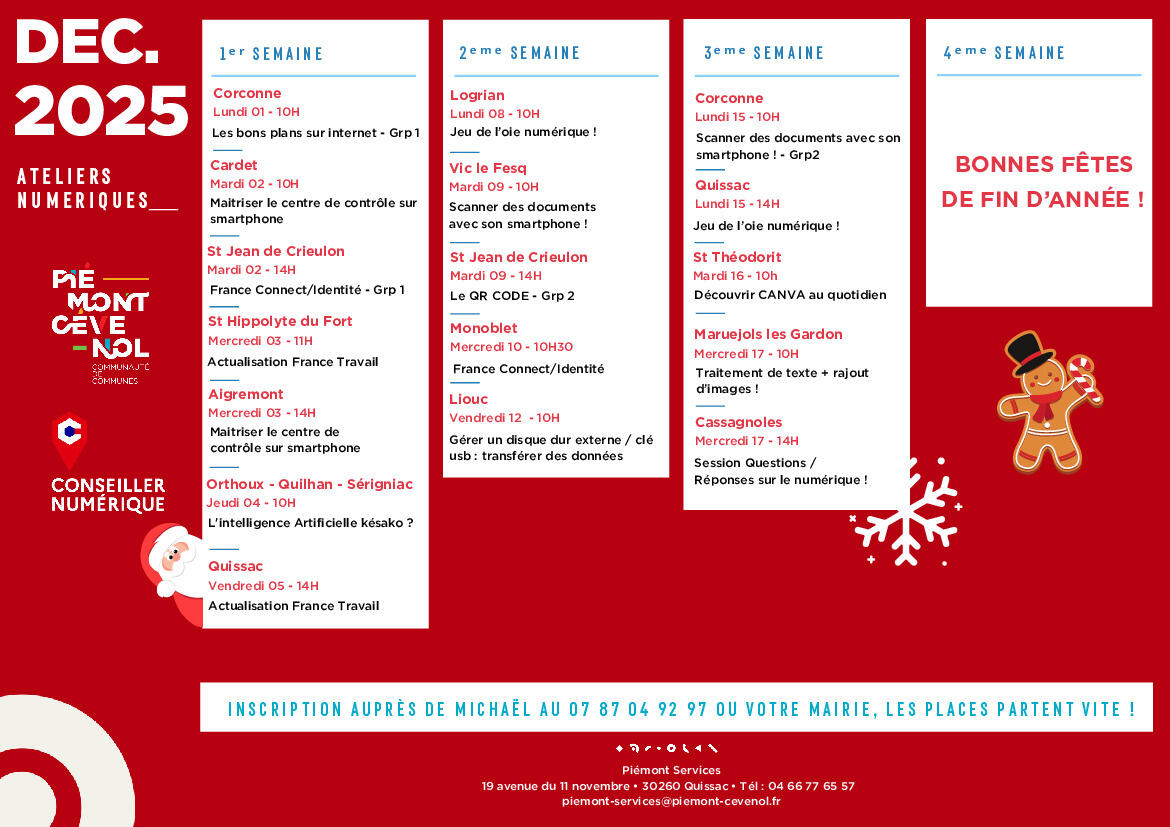 Calendrier des Ateliers Numériques de décembre 2025