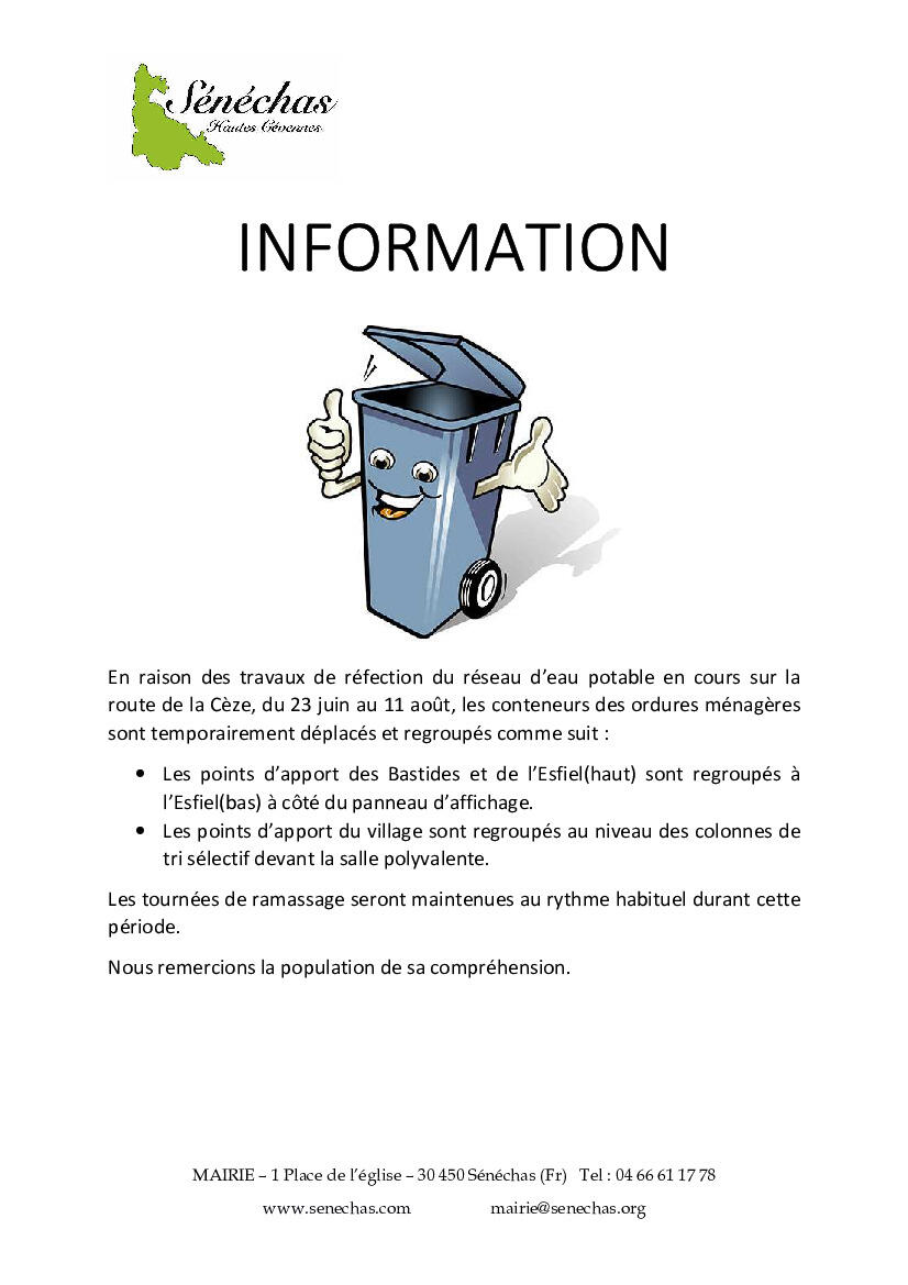 En raison des travaux de réfection du réseau d’eau potable en cours sur la route de la Cèze, du 23 juin au 11 août, les conteneurs des ordures ménagères sont temporairement déplacés et regroupés comme suit :