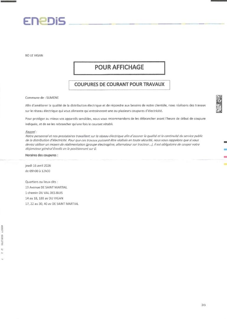 Enedis vous informe : Coupure de courant le 16 avril 08/04/2026 de 9h00 à 12h00, secteurs indiqués ci-dessous