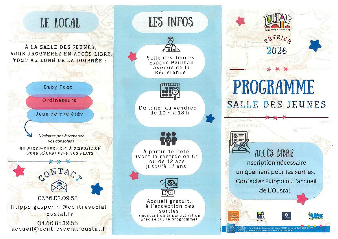En pièces jointes, vous trouverez les propositions d'activités du centre social l'Oustal de St-Jean-Du-Gard, sur la salle des jeunes
