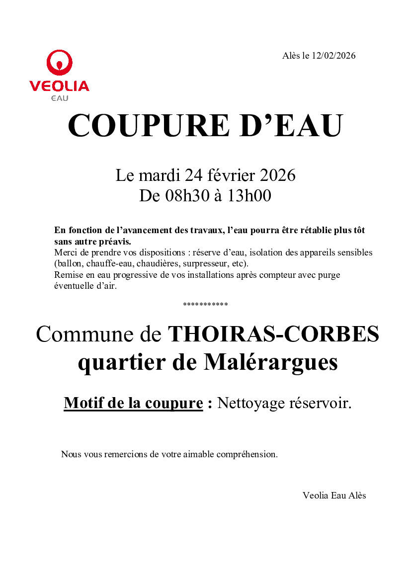 COUPURE D’EAU Le mardi 24 février 2026 De 08h30 à 13h00 - Commune de THOIRAS-CORBÈS quartier de Malérargues