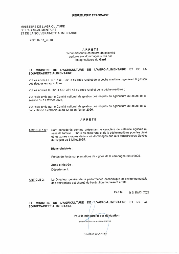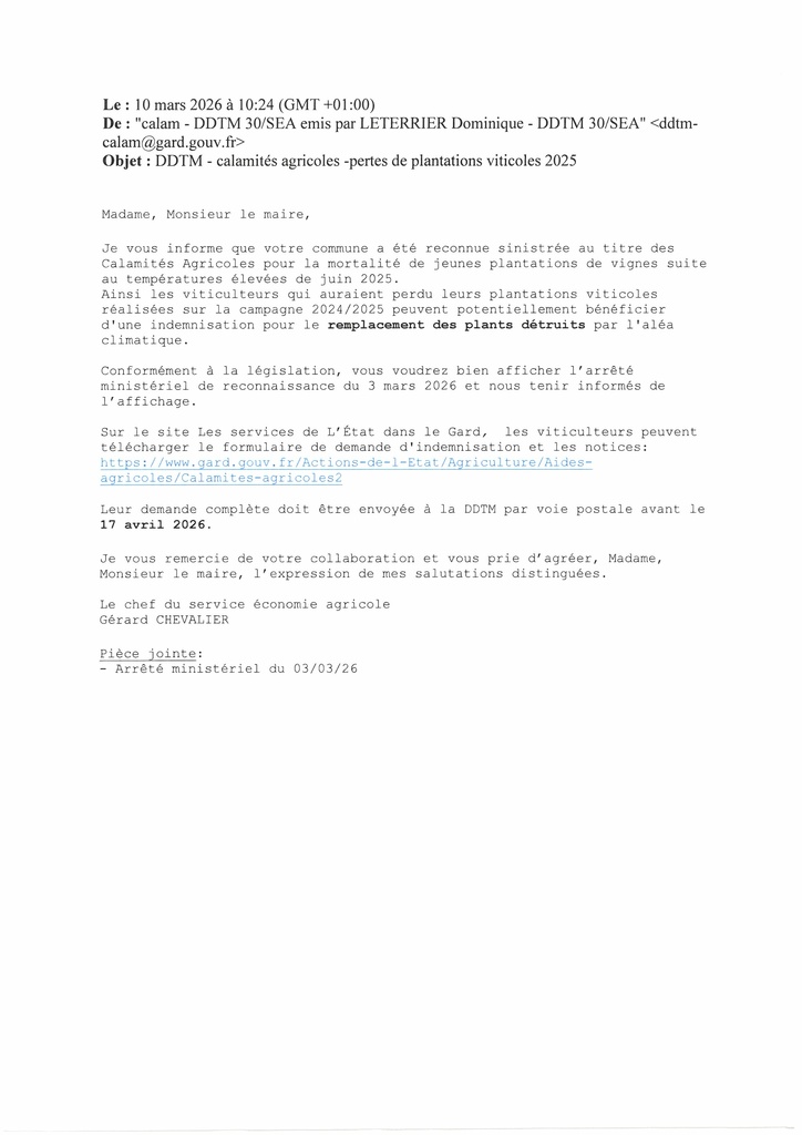 Calamités agricoles - remplacement des plants détruits