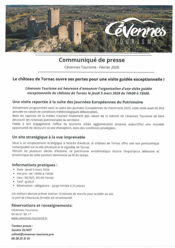 / Jeudi 5/03 -14h00 à 15h00 Visite du Château de Tornac