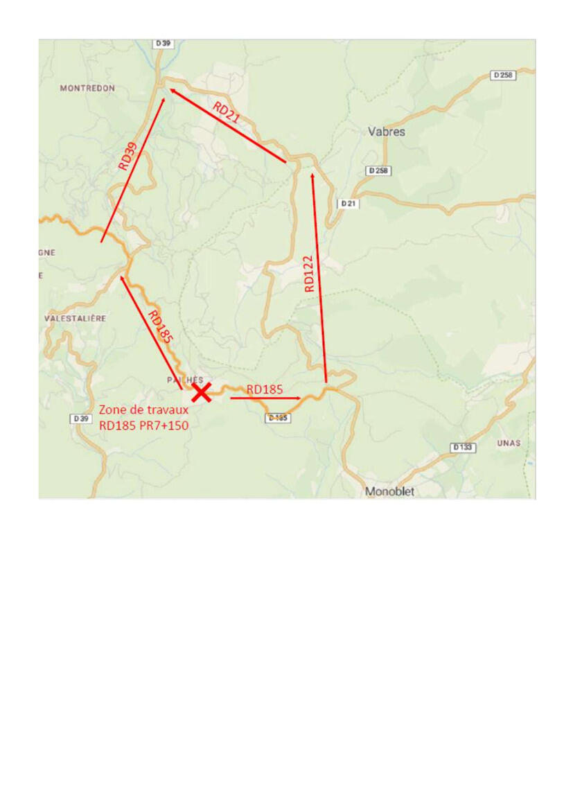 Déviation pour travaux route de Pailhès, commune de Monoblet