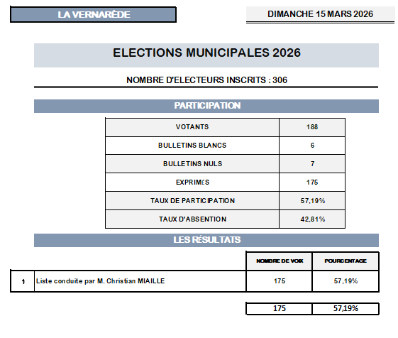 Veuillez trouver ci-dessous les résultats des élections municipales pour la Commune de La Vernarède :