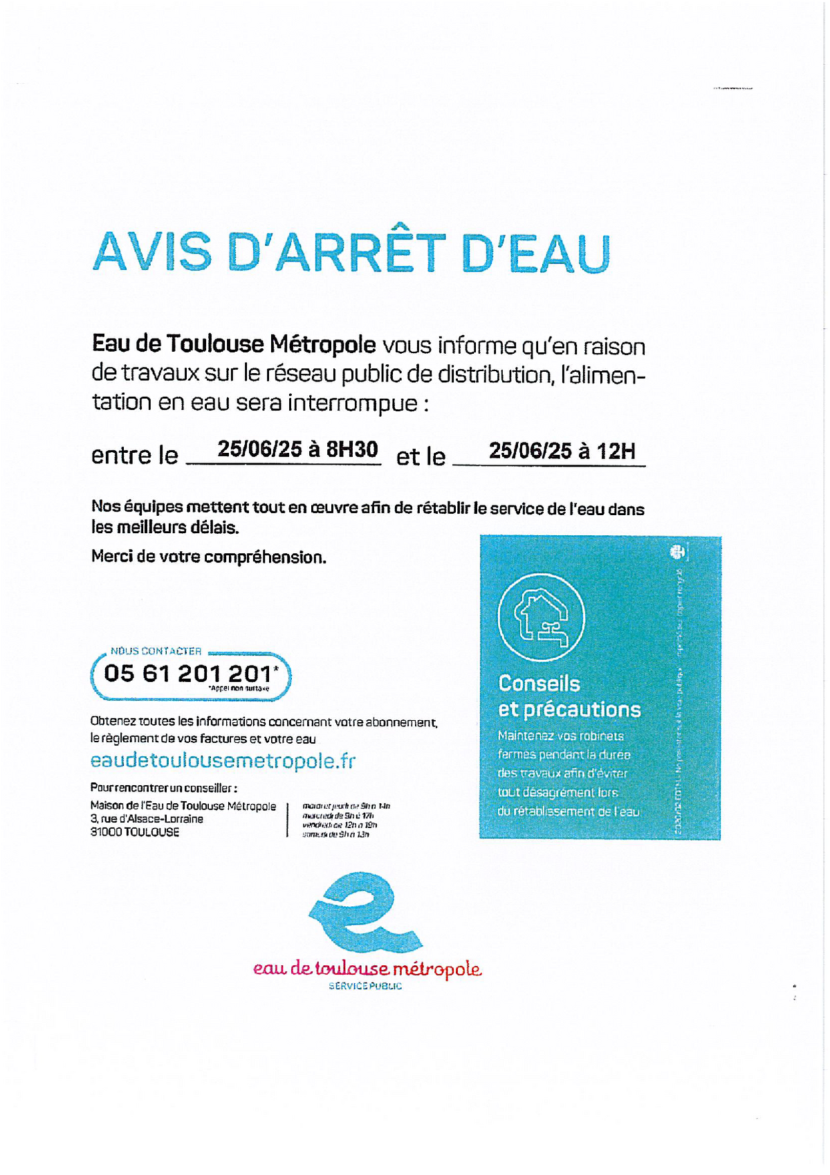 / Coupure d'eau demain 25 juin de 8h30 à 12h