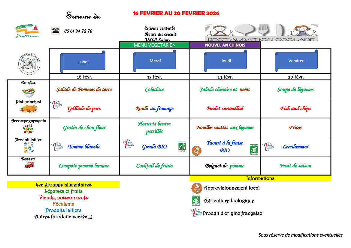 MENU du 16 au 20 février