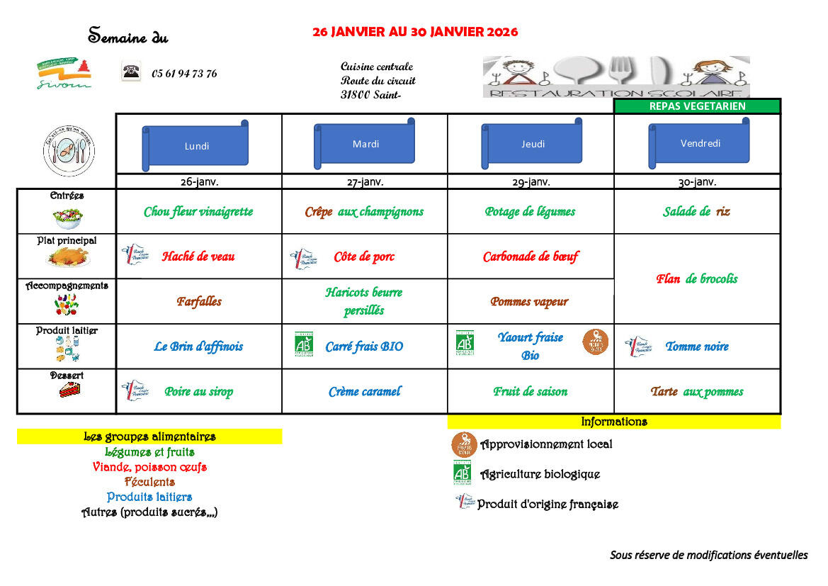 MENU du 26 au 30 janvier