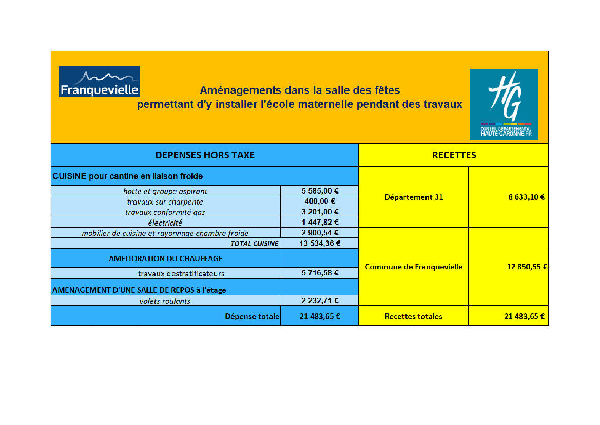 Avec le soutien financier du Département 31, Franquevielle a également du investir pour doter l'étage du foyer de volets roulants, améliorer le rendement du chauffage de la grande salle et surtout, équiper la cuisine et la chambre froide. Ces équipements réalisés à l'occasion du déménagement de l 'école resteront acquis à la salle des fêtes et profiteront donc à tous les usagers de la salle, associations comme particuliers.
