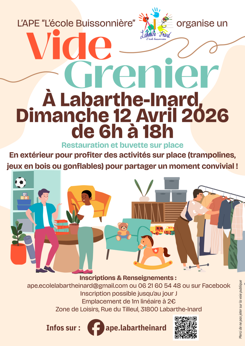 Chiner, partager et profiter d’un moment en famille : voilà ce que propose l’Association des Parents d’Élèves « L’École Buissonnière » de Labarthe-Inard avec son vide-grenier organisé dimanche 12 avril 2026.