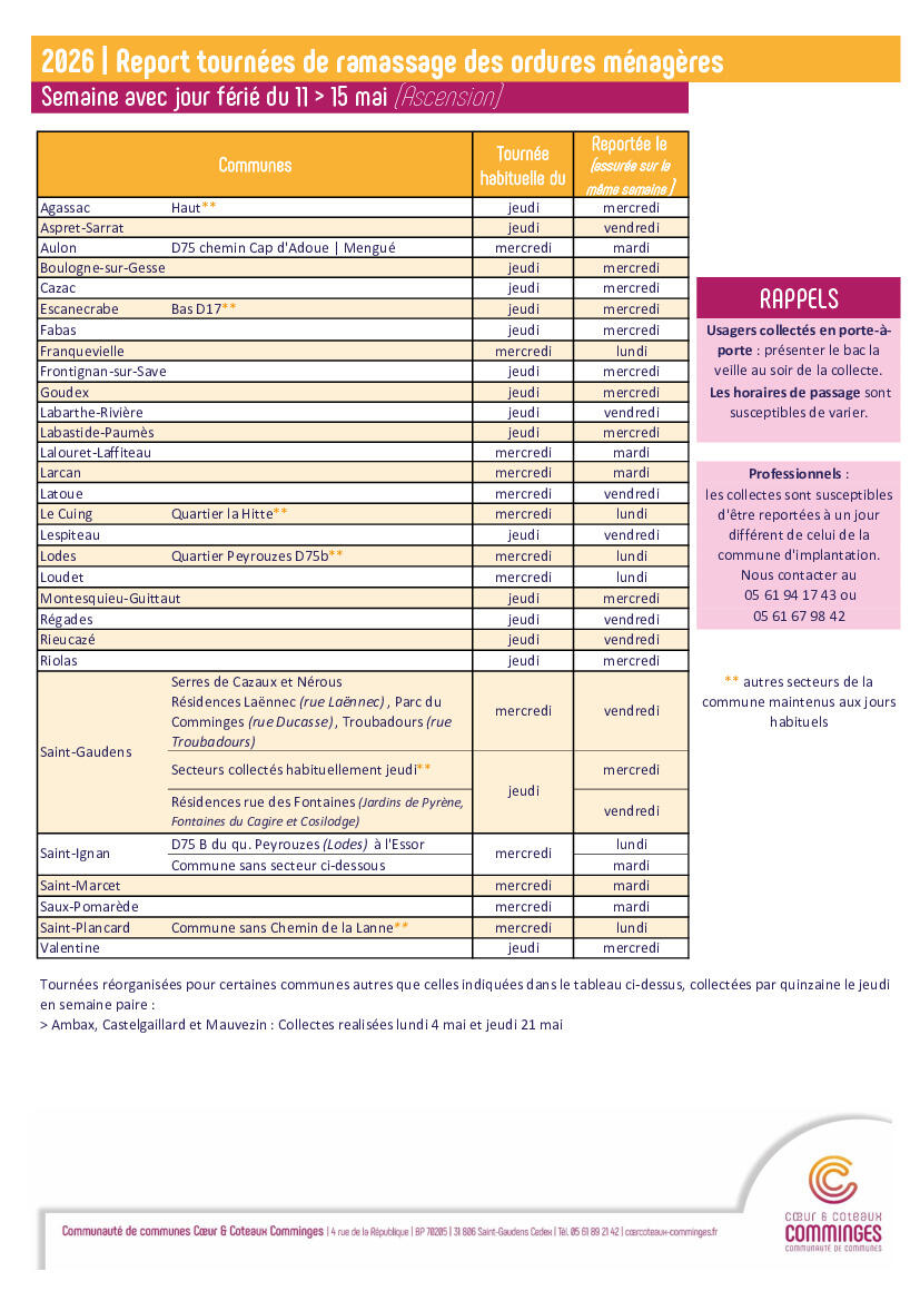Vous trouverez ci-joint le document relatifs au report des tournées de collecte des ordures ménagères pour la semaine du 11 au 15 mai (Ascension).