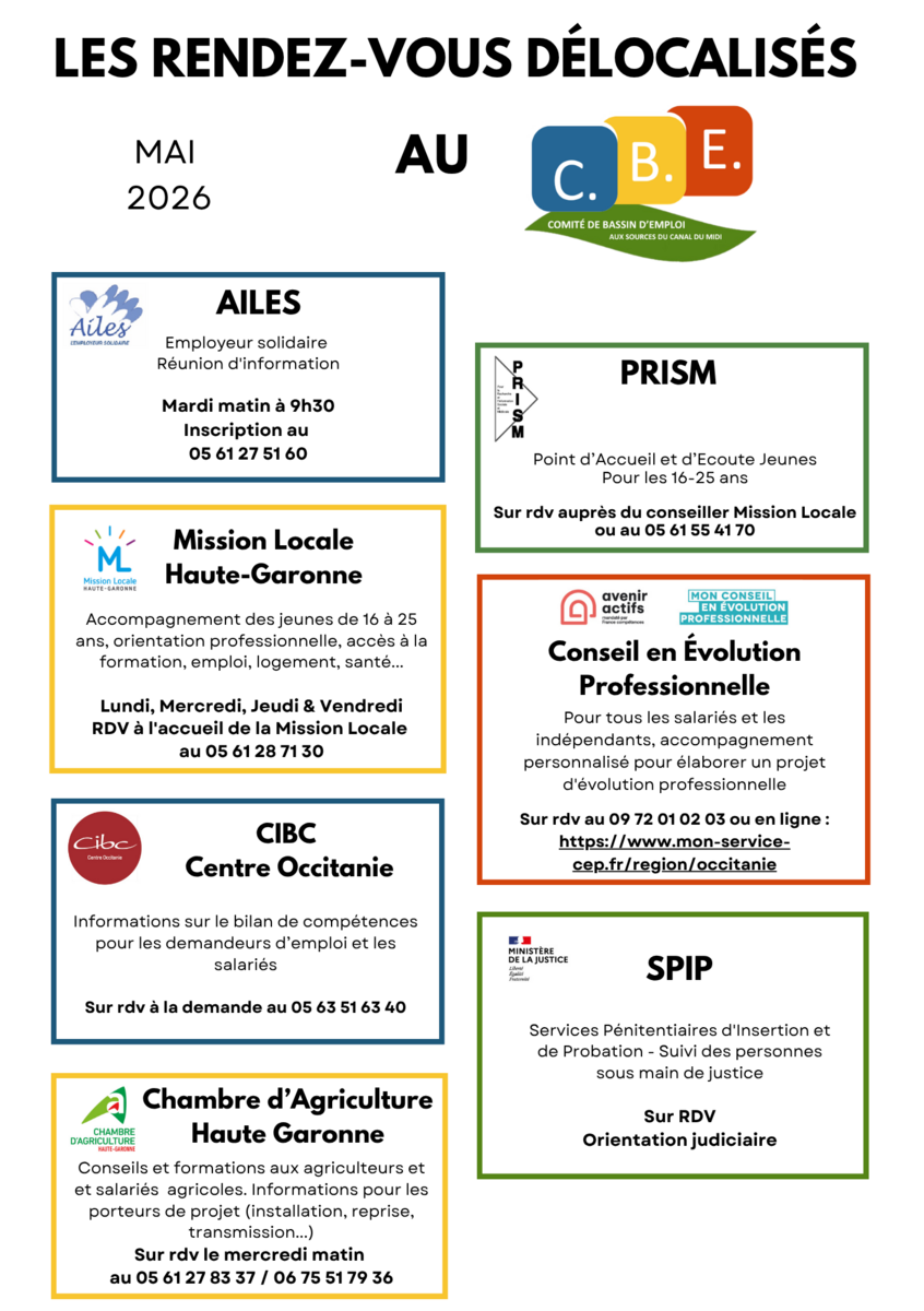 Rendez-vous délocalisés du CBE 22/04/2026 Les rendez-vous délocalisés du Comité Bassin d'Emploi de Revel.