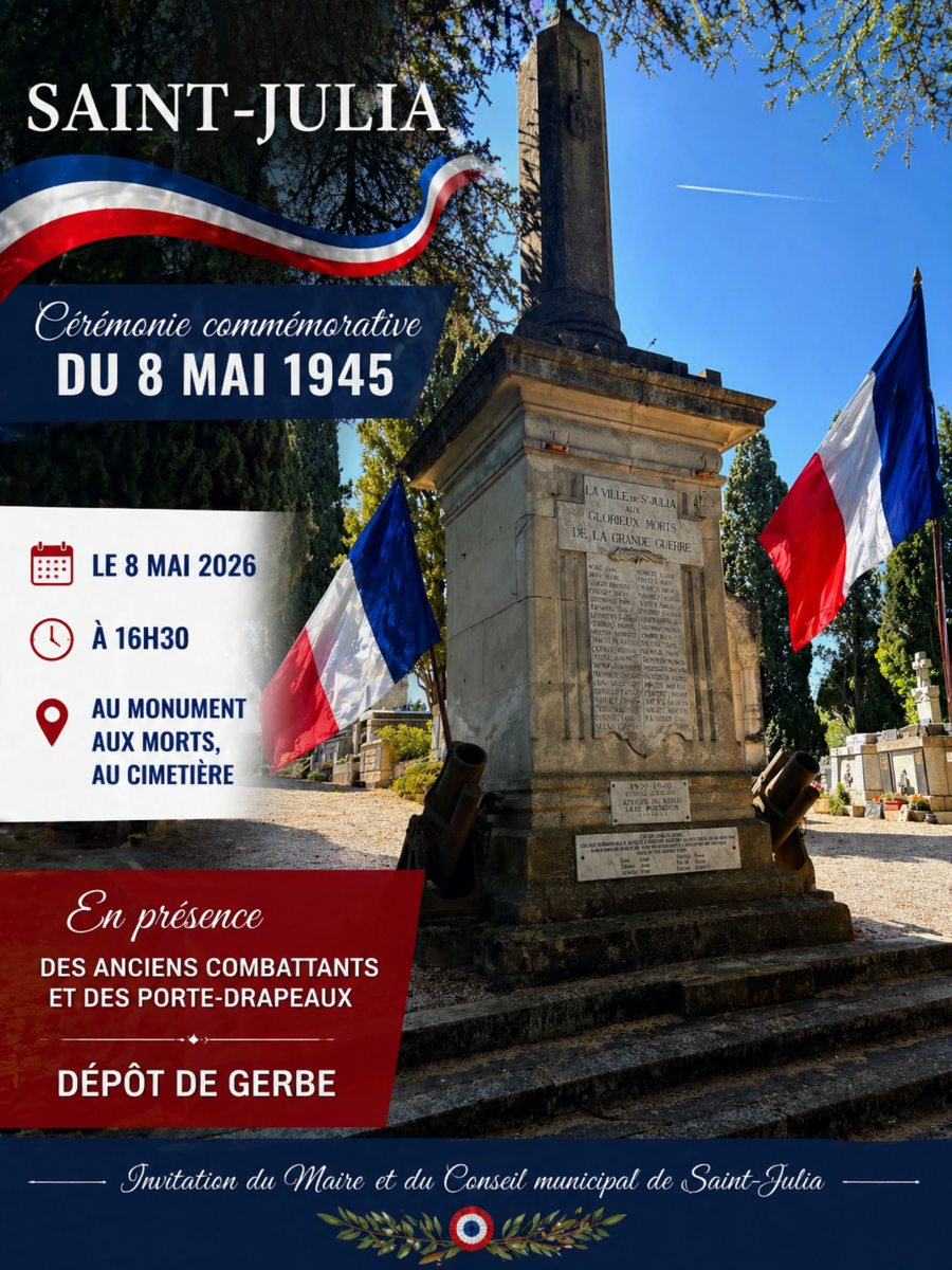 Le Maire et le Conseil municipal de Saint-Julia vous invitent à la cérémonie commémorative de la Victoire du 8 mai 1945.