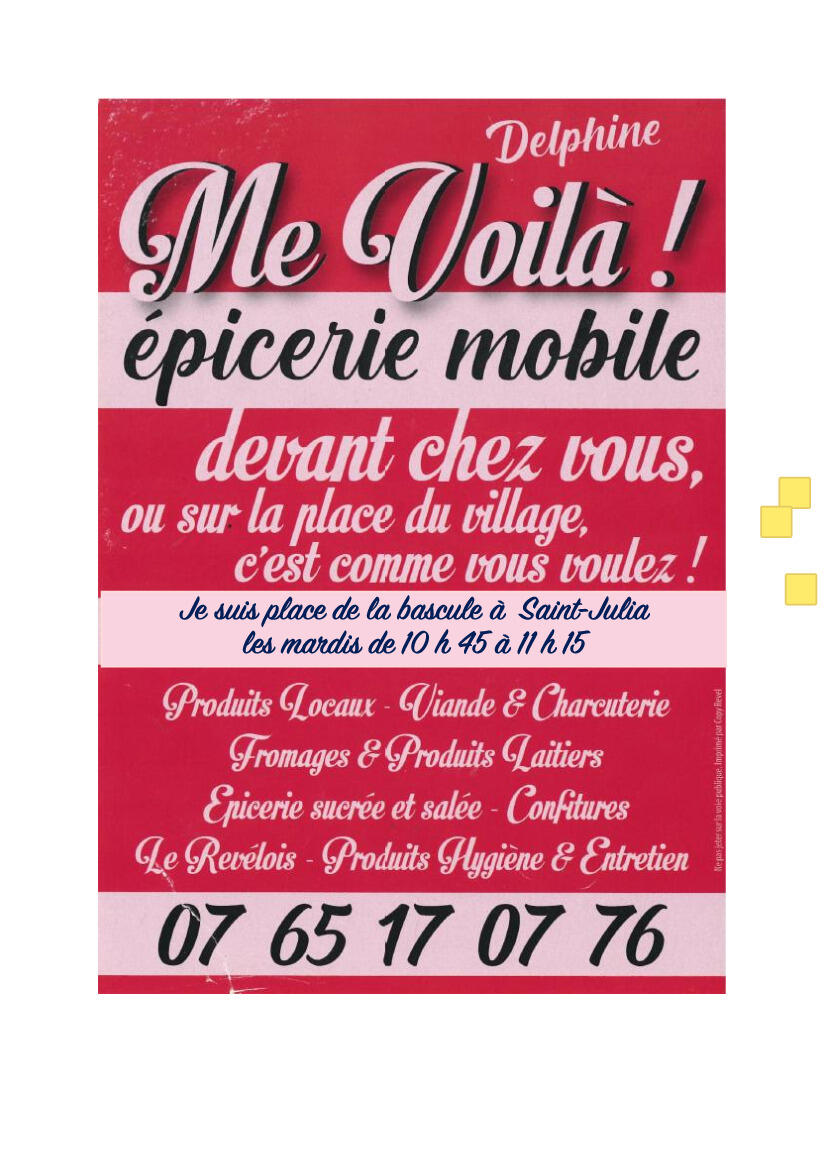 Delphine de l'épicerie ambulante "Me Voilà" stationne dorénavant les mardis de 10h45 à 11h15 place de la bascule à Saint-Julia