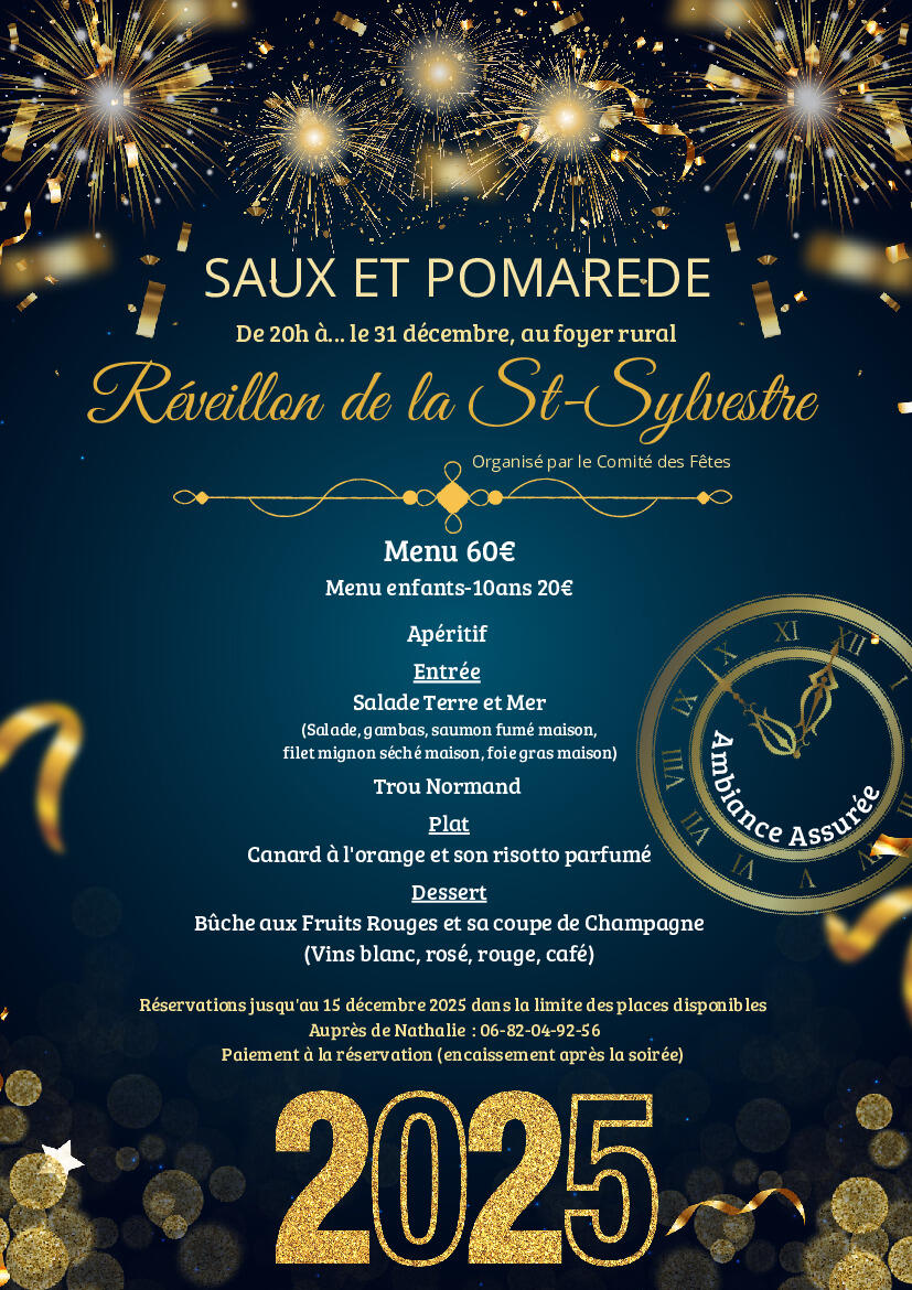 Réveillon de la St-Sylvestre organisé par le Comité des Fêtes ; réservation jusqu'au 15 décembre ; voir flyer.