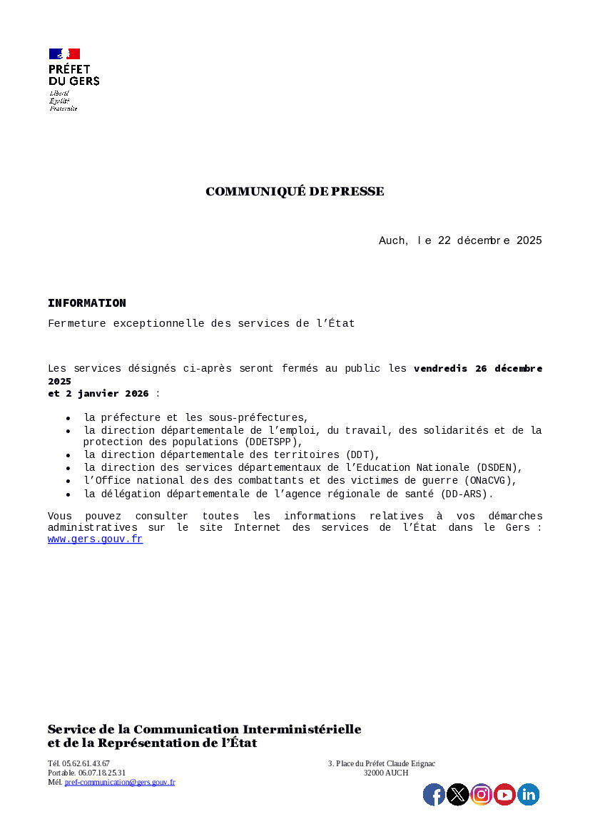 Préfecture | Fermeture exceptionnelle des services de l’État