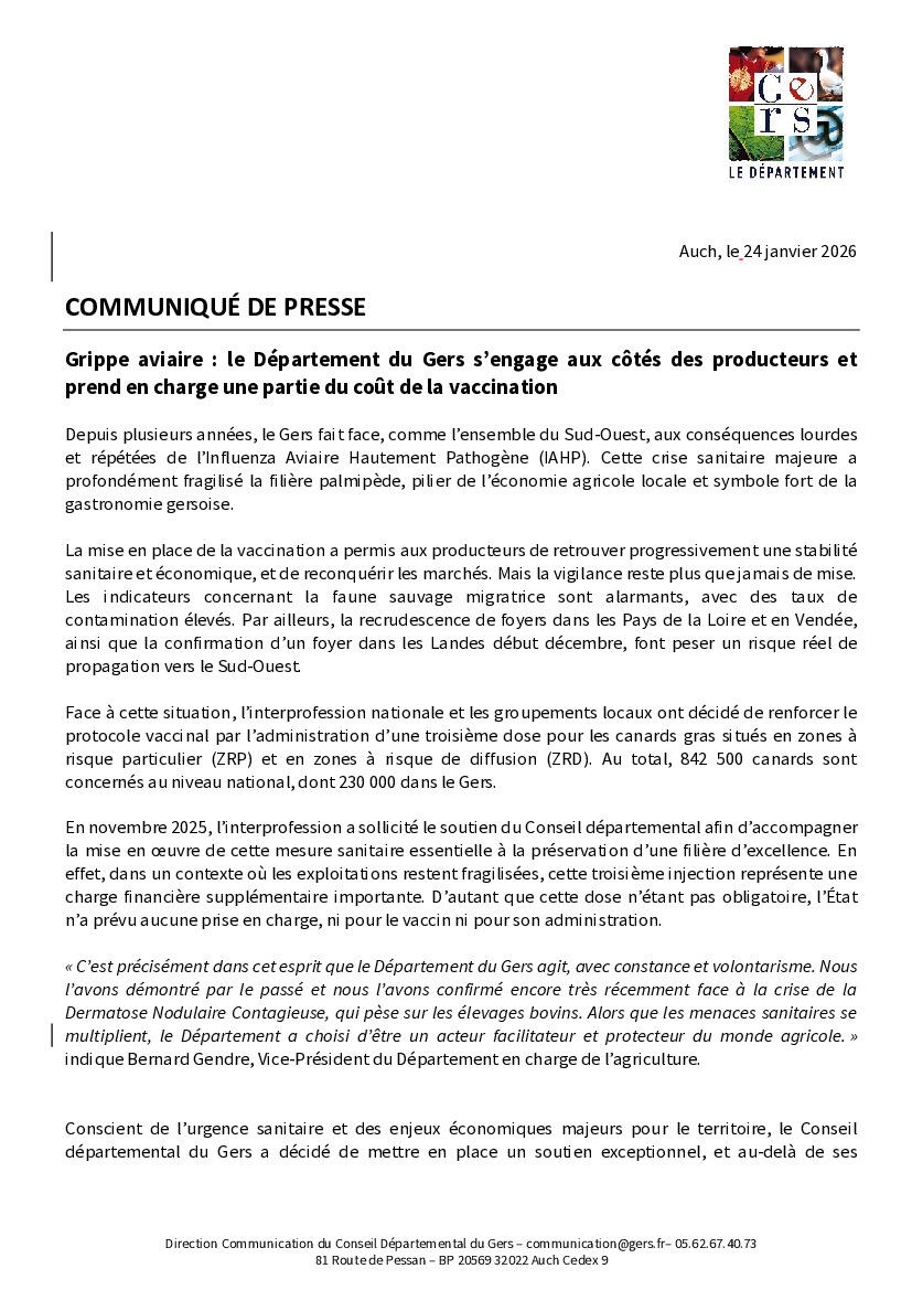 Conseil départemental 25/01/2026 Grippe aviaire : le Département du Gers s’engage aux côtés des producteurs et prend en charge une partie du coût de la vaccination