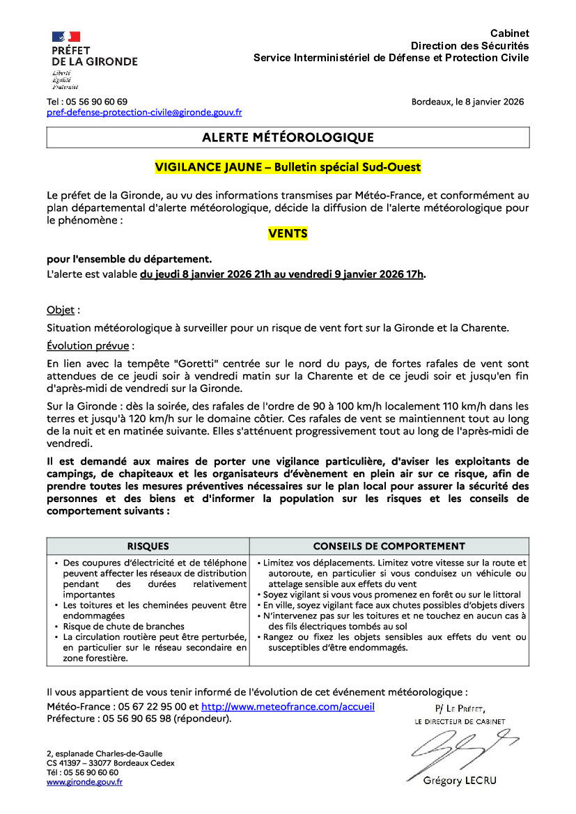 MESSAGE DE LA PRÉFECTURE DE LA GIRONDE : VENTS