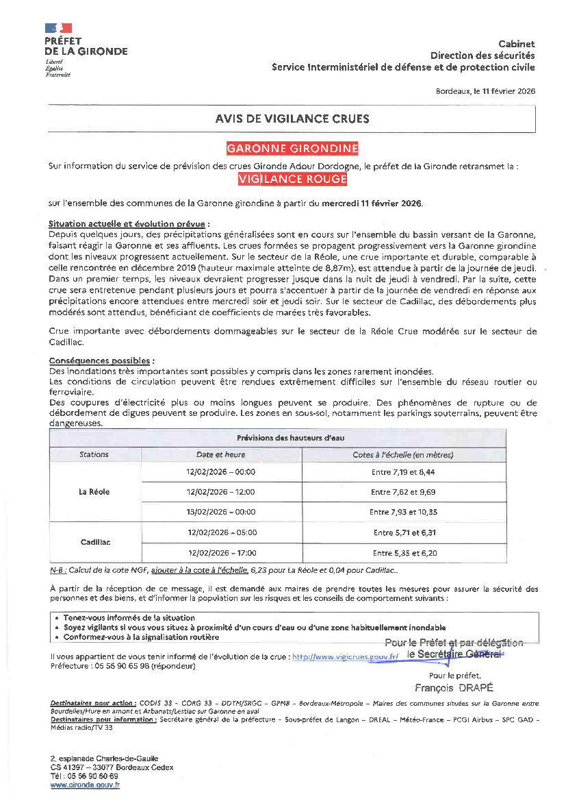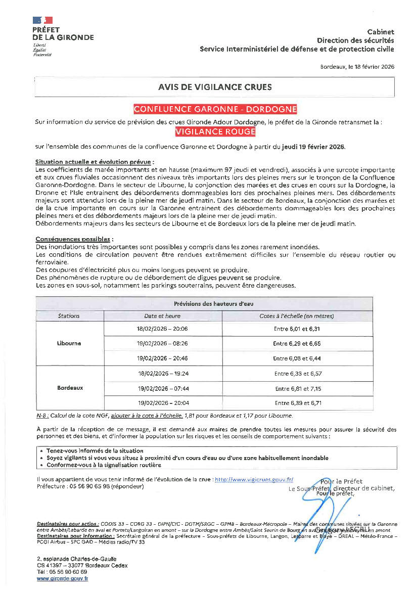 MESSAGE DE LA PRÉFECTURE DE LA GIRONDE : CRUES