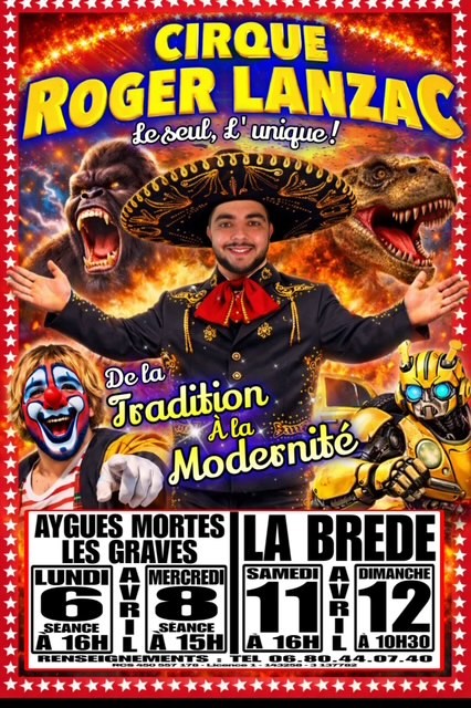 Le cirque Roger Lanzac sera présent sur notre commune pour 2 représentations le lundi 6 avril à 16h et le mercredi 8 avril à 15h sur la plaine des sports.