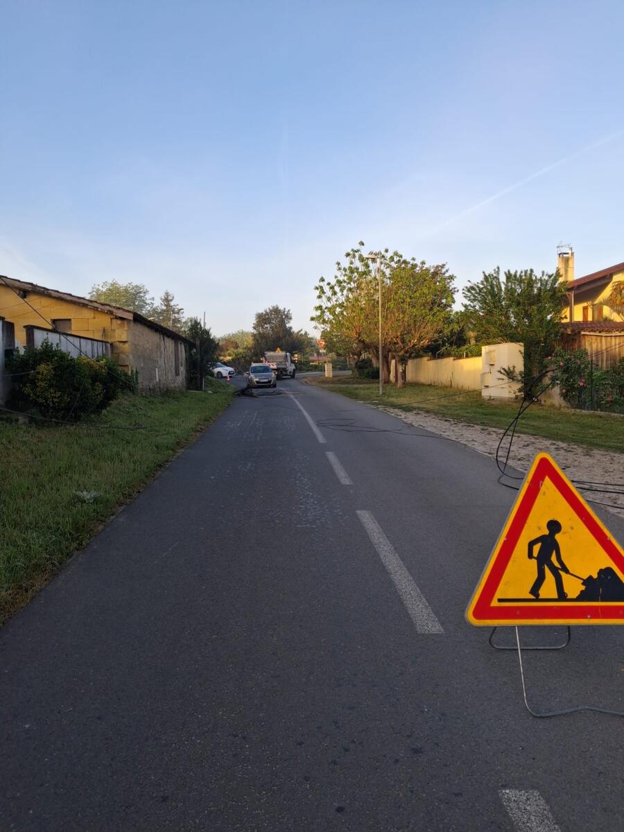Un poteau a été arraché , des câbles électriques sont au sol . Ne pas forcer le passage.